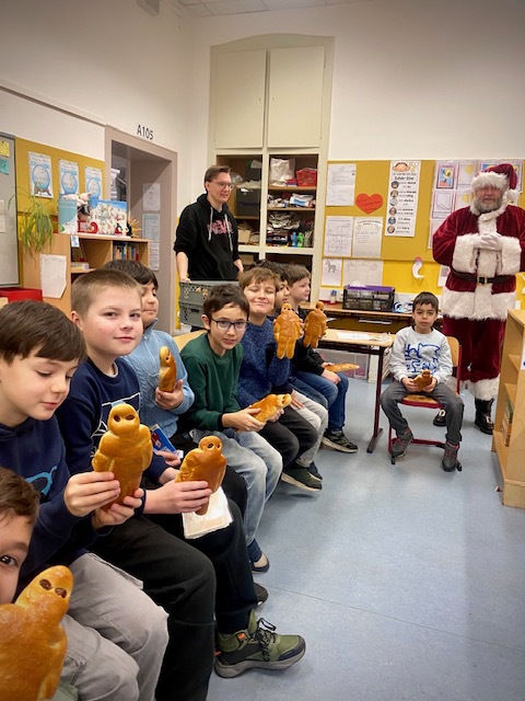 Als Dank las er allen eine schöne Geschichte vor und verteilte für alle Kinder der Schule am Ende einen großen Schokoladennikolaus.