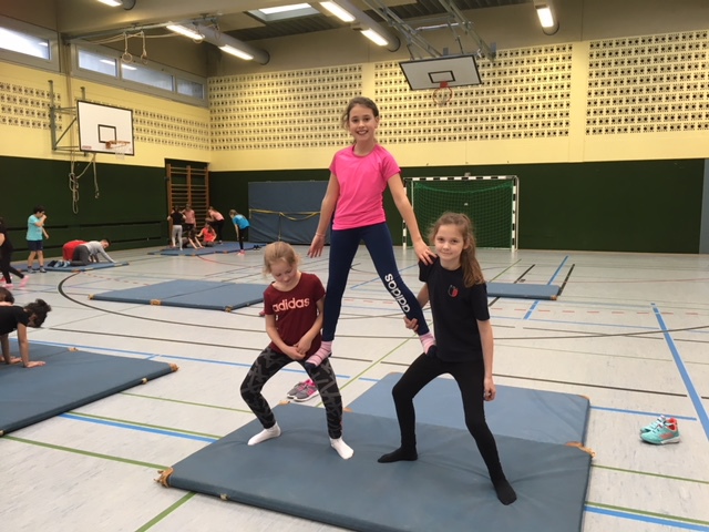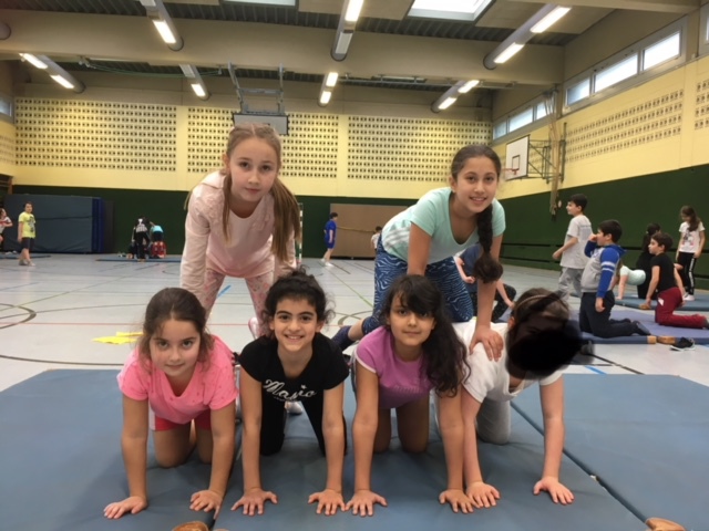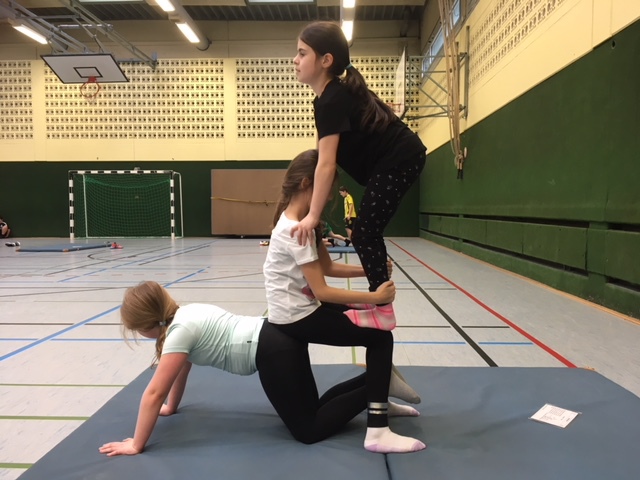 Die Klassen 4 haben das Thema Akrobatik durchgenommen. Die wichtigsten Regeln sind: Vertrauen und jemanden berühren können, bei Türmen niemals auf der Wirbelsäule stehen, nur die Arme und Beine genau senkrecht unterm Körper stehen, die akrobatischen Figuren langsam auflösen und sich beim Absteigen gegenseitig helfen. Wenn man diese Regeln einhält kann man tolle Figuren machen. Aber wenn man die Regeln nicht einhält wird es unangenehm für den Untermann.